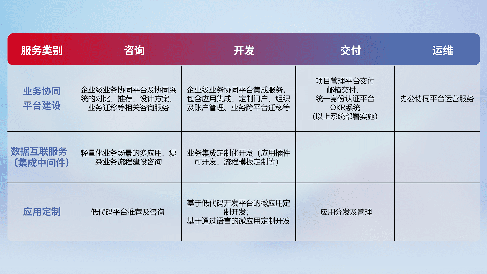 针对钉钉、、、、企微、、、IDaas等平台级产品提供产品的规划、、、方案、、交付、、定制化开发等服务,,,实现如统一协同办公、、智能客户服务、、、、混合会议管理、、、、智能数据查询、、等业务场景,,,实现数字化转型。。。。